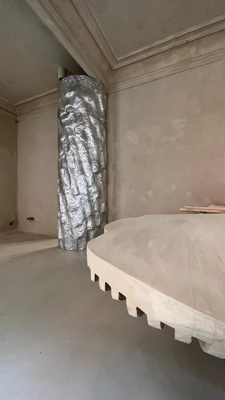 "Enseguida entendí sus creaciones como un acto de fosilizar la realidad y quise reflejarlo en su nuevo hogar. Una vivienda es la segunda piel del humano en la tierra. En este caso, una piel de arcilla que solidifica los usos en diferentes formas", explica.
